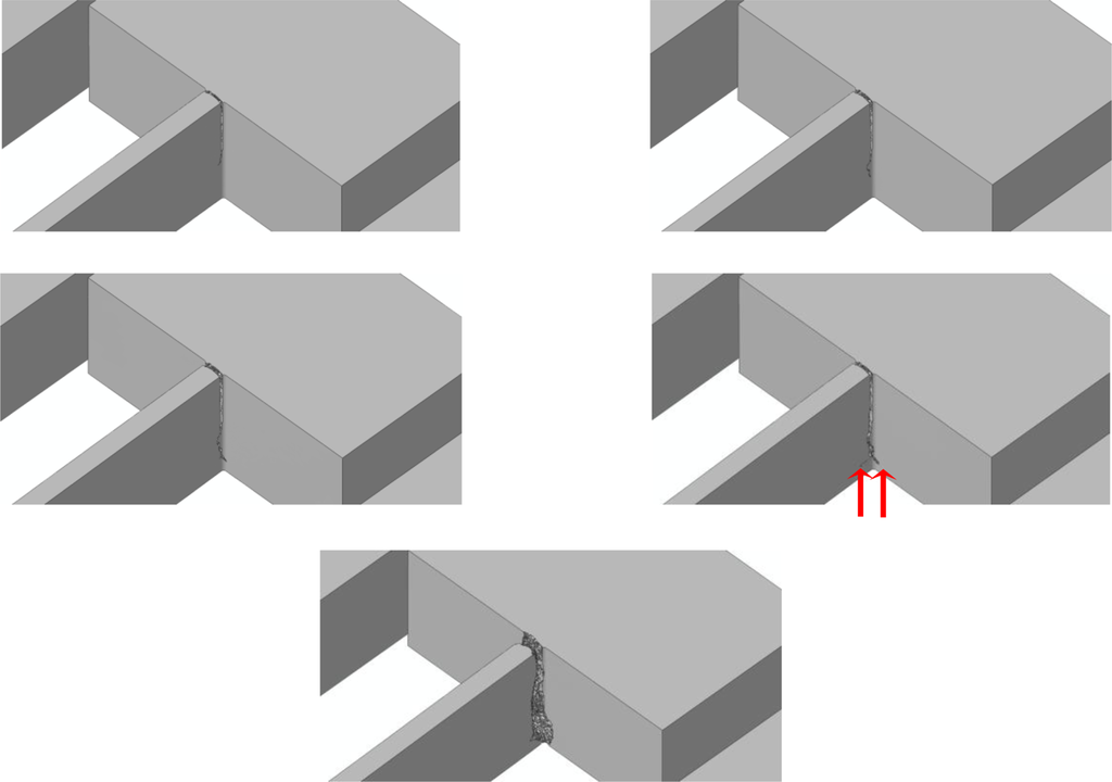 Because of the re-entrant corners and the spring vibrations induced by the impact, it happens that crack starts propagating very close to the spring-anchor connection, at the top (bottom) free surface in case of a bottom (top) drop. This is clearly depicted in Figures 11 and 12, which gather the two evolving crack patterns, as obtained with de = 100 nm. The spring dynamics also affects the crack evolution, leading to branching in the bottom drop case (marked with the two arrows in Figure 11) and to kinking in the top drop case (marked with the arrow in Figure 12).