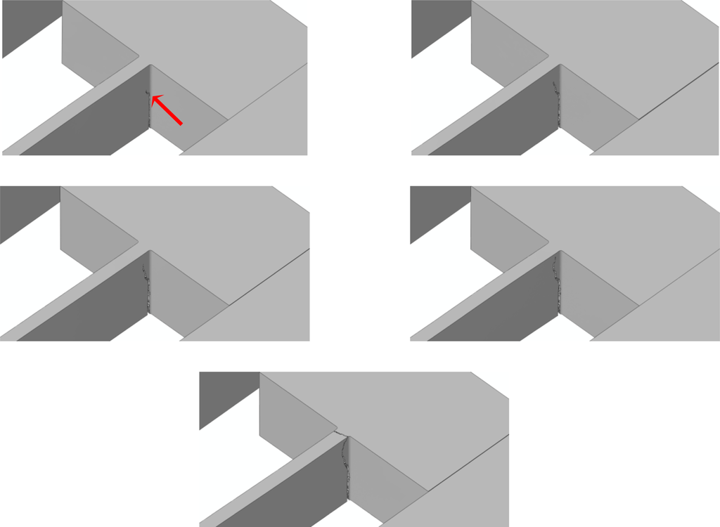 Having assessed the objectivity of the proposed two-scale approach, we now investigate two alternative drop configurations that do not induce a torsional deformation in the suspension springs, see [21]. These two drops are characterized by the package striking the target with side A or B, see Figure 7(a): because of inertial effects, the former drop induces a bending-dominated state of stress in the springs, whereas the latter drop induces a tension-dominated stress state in the failing spring [21]. The forecasted crack paths induced by the bending- and tension-dominated loadings are respectively shown in Figures 13 and 14. Figures 15 and 16 instead show the evolution of the failure mechanisms in the two cases.
