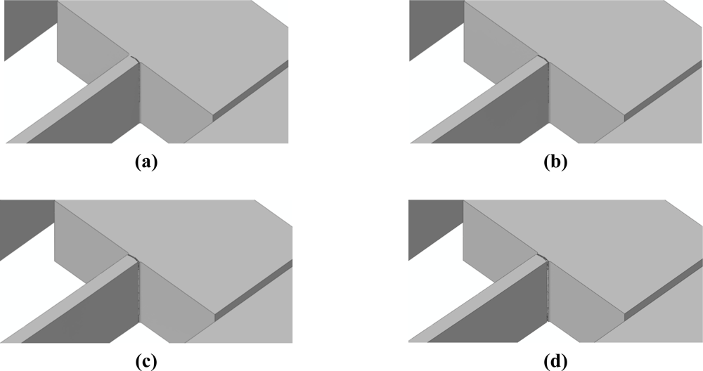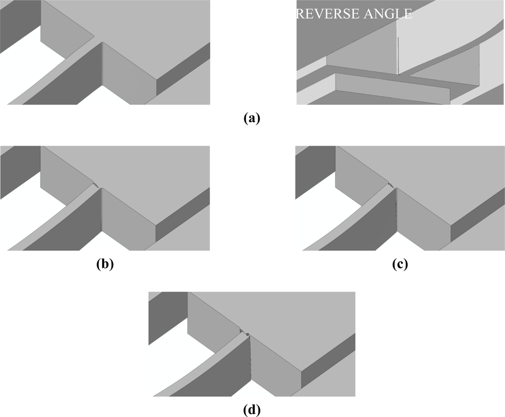 To assess the effects of mesh refinement on the predicted failure mechanism, we handle three values of the characteristic element size de in the failing region, i.e., at the connection between the MEMS anchor and suspension springs: de = 200 nm [Figure 8(b)], de = 150 nm [Figure 8(c)], and de = 100 nm [Figure 8(d)]. As depicted in Figure 8, the space discretizations are purposely refined much only within the regions expected to fail, according to previous investigations [18–22]; out of these regions, the MEMS is instead coarsely meshed to reduce the computational burden. The aforementioned values of de are all much higher than that necessary to achieve accuracy in the description of crack propagation at the micro-scale, which amounts to de = 10 nm [21].
