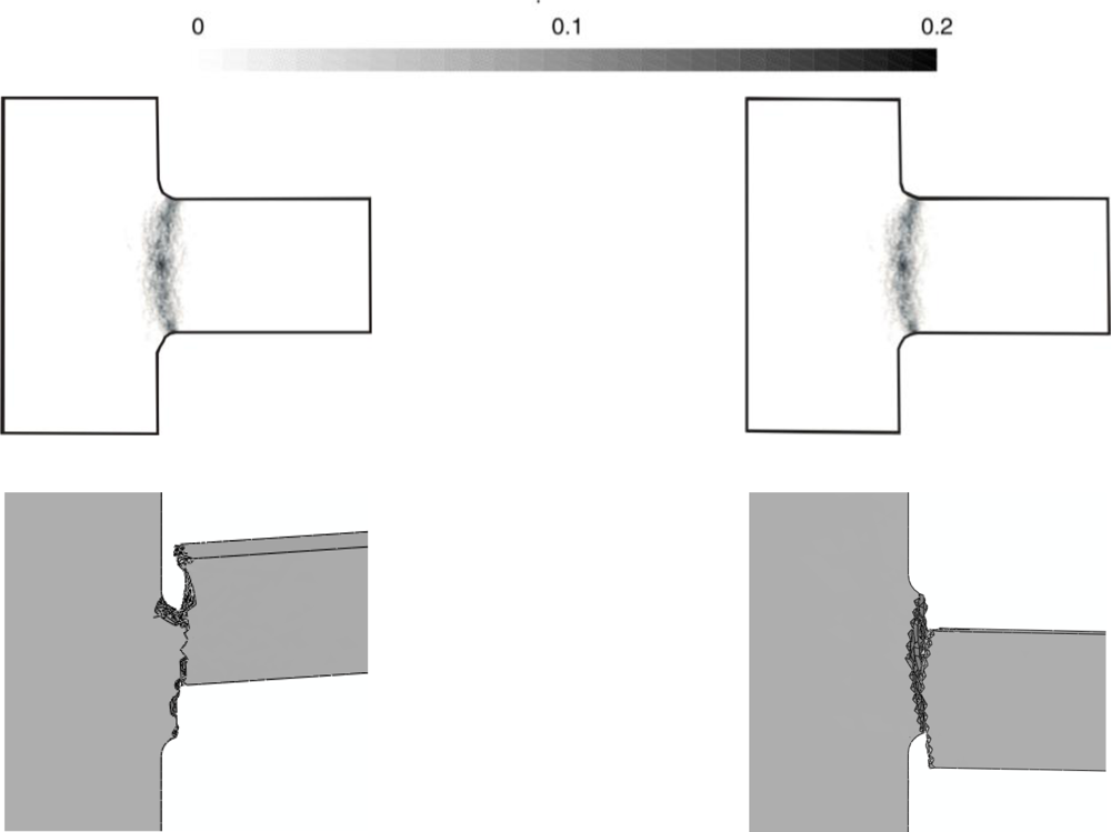 A comparison of the failure mechanisms predicted by the present two-scale approach and by the three-scale approach of [21] is illustrated in Figure 17, for the two drop configurations. The probabilistic failure maps of the Monte-Carlo simulations (top row of Figure 17) have this meaning: a value equal to 0 means that, independently of the polysilicon microstructure, a crack would never pass through that point; on the contrary, a value equal to 1 means that the crack is surely nucleated at that point after the drop. It results that both approaches predict crack patterns well confined around the spring cross-section connected to the anchor, as also reported experimentally (see Figure 2).