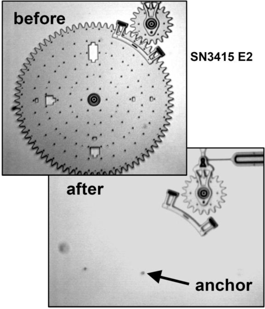 Other microsystems are exposed to shock-induced failures located at or close to the anchor. Tanner et al. in [24] showed that micro-gears subjected to a high-g loadings (on the order of 104–105 g, like those induced by drops, see [18]) may break away from the substrate, as shown in Figure 4.
