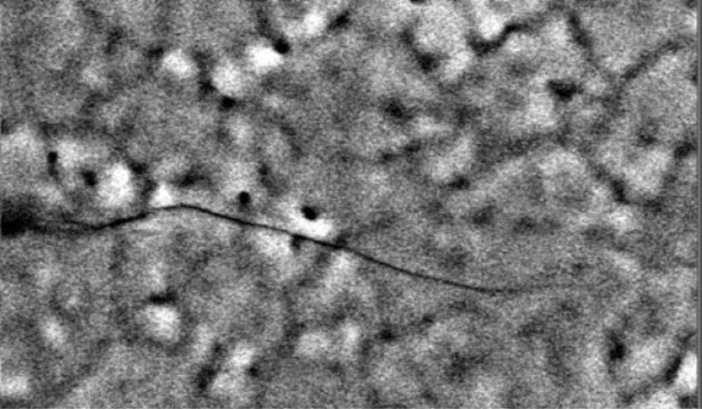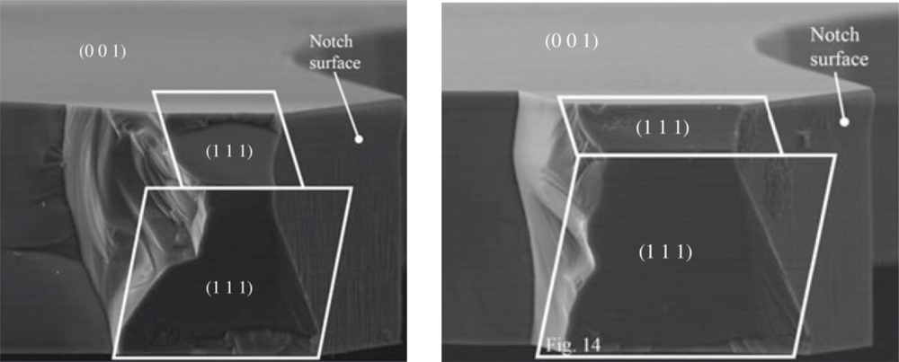 Even though failures happen under shock loadings, typically exceeding 104 g, stochastic effects at the micro-scale may affect the outcomes. This is primarily due to the microstructure of polysilicon films: each microsystem features its own polycrystal morphology in the failing regions, and the overall stress- or shock-carrying capacity turns out to be therefore affected. For instance, Figure 5 shows the path followed by a crack in a microsystem used to assess the fatigue properties of polysilicon [25]; it can be clearly seen that crack kinks almost every time its tip crosses a grain boundary (represented in the figure by dark lines), because of the different orientation of the crystal lattice inside each grain. As shown experimentally in [26], the different atom packing along different crystal orientations causes the crack resistance to be maximum along the {100} crystallographic directions, and minimum along the {111} directions; inside each grain, cracks therefore tend to follow a path dependent on the crystal lattice orientation (Figure 6).