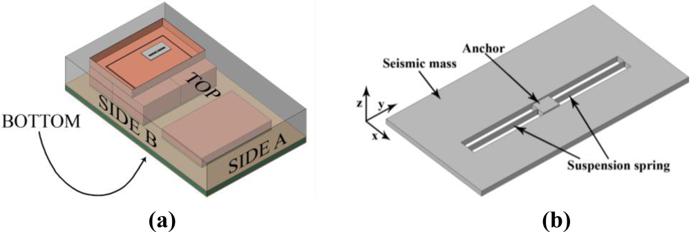 In order to reduce the computational burden, in [18–22] a multi-scale framework was suggested and adopted, where the dynamics of the whole MEMS was tracked to eventually foresee the propagation of cracks in the failing region(s). Here, by exploiting the sensor geometry sketched in Figure 7, we decompose the problem into a microscopic and a mesoscopic ones. In macro-scale analyses the whole device [Figure 7(a)], subjected to shock loads, is modeled. At this length-scale the dynamics of the MEMS is disregarded, since its mass is so small (as compared to the mass of the whole device) that inertial forces associated to its motion can not affect the package dynamics. In meso-scale analyses we instead model the dynamics of the MEMS [Figure 7(b)], as induced by the stress waves propagating inside the package and impinging upon the anchor point. Micro-scale analyses, termed this way since they focus on the effects of the polysilicon microstructure on failure, are not considered in the two-scale approach here investigated.