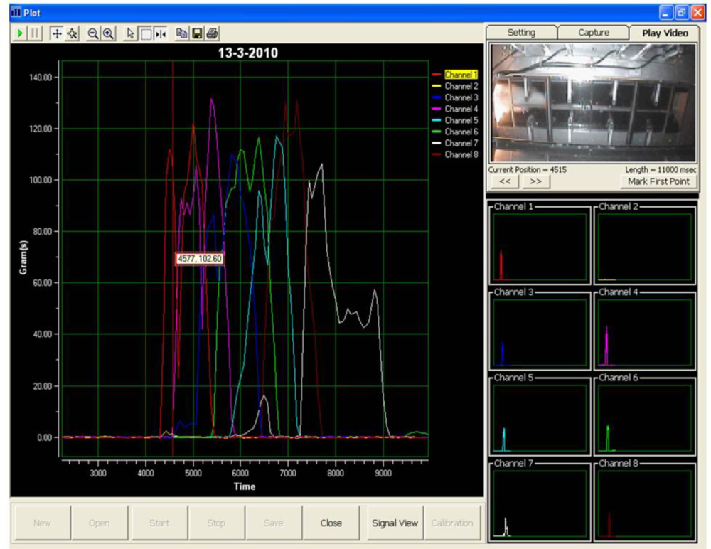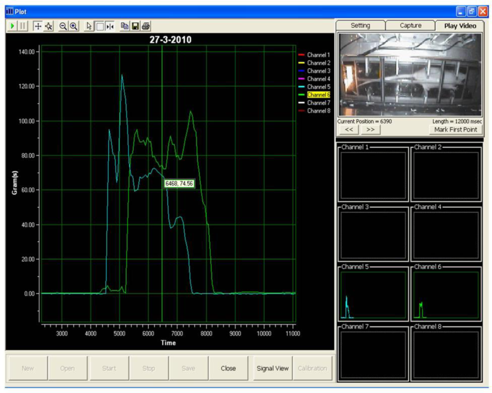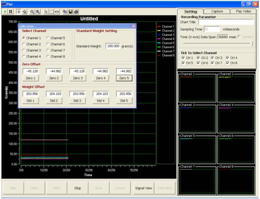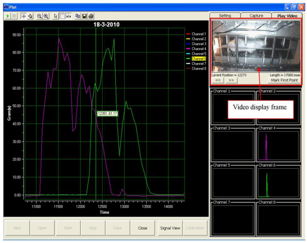 Visual Basic 6 was used to program the data acquisition software. A graphical user interface for the data acquisition system was deployed, as shown in Figure 3. The layout of the data acquisition system consists of a real-time video display frame, eight channels signal monitoring frame and a real-time signal display frame.