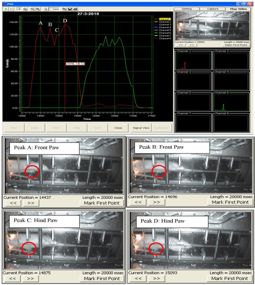 Other researchers [10], have assumed that the first and second peaks represent the front and hind paws respectively. In fact, it is difficult to differentiate between the front and hind paw without the aid of the video display frame, as shown from the present study. Figure 9 clearly illustrates the uncertainty associated with the occurrence of peak signals. While Peak A represents the front paw, the second peak shown (Peak B) is also the front paw, whereas the third and fourth peaks (Peak C) and (Peak D) indicate the hind paws, respectively. From the results obtained, it has been proven that the assumption of Min et al. [10] is not realistically applicable for stepping force measurement. Hence, the use of the video display frame is essential for accurate observation.