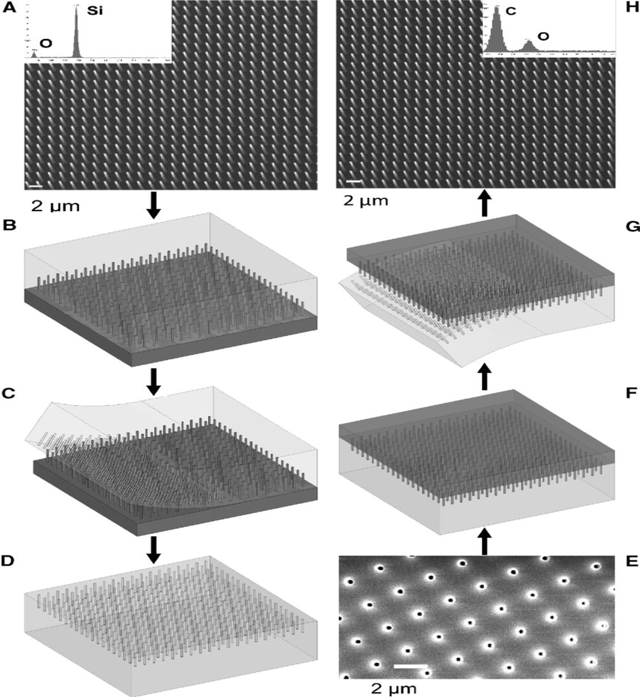 For instance, micromolding is one of the most effective techniques for fabricating nanowires with high aspect ratio [33]. In this method, an initial polydimethylsiloxane (PDMS) mold which is the master is produced with the desired length, radius and pitch (distance between nanowires) using a photolighraphy process. Then an antisticking layer—PDMS or paraffin—is poured into the master and cured for a few hours and later peeled off. This antisticking layer is shown in the Figure 1(D). A SEM image of the negative PDMS mold onto which the polymer solution is poured along with a supporting liquid metal such that the holes are filled up with the liquid can be seen in Figure 1(E).