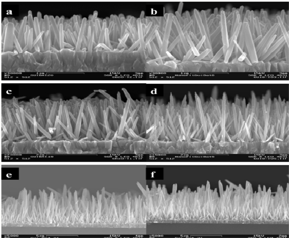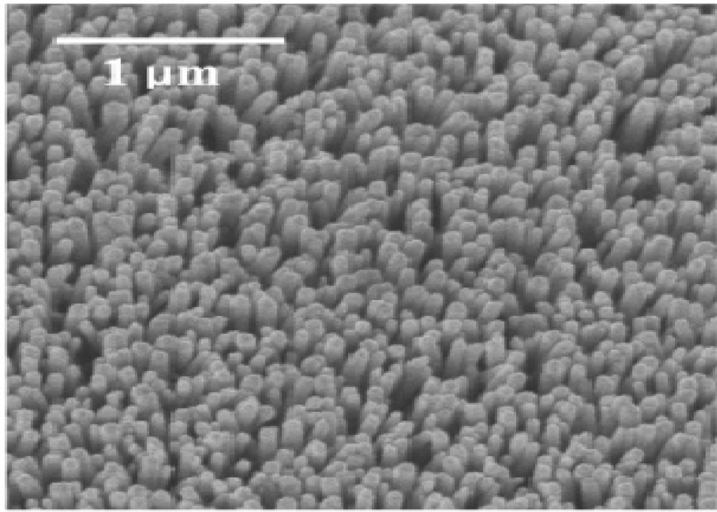 The fabrication of ZnO nanorods at lower temperatures using aqueous solutions is also currently being done by a lot of researchers. Kumar et al. has proposed the growth of ZnO nanorods at a lower temperature of 95 °C [97] using zinc nitrate, Zn(NO3)·xH2O and hexamethylenetetramine for 10 h. These nanorods are actually grown on a silicon substrate having a seed layer that was coated using an ALD growth method. It is mentioned that irrespective of the seed layer charge, the nanorods will grow in an aligned manner depending on the distribution of the layer. The Figure 10 shows the SEM image of the ZnO nanorods that were grown on the silicon substrate containing the seed layer. It is also said that the ZnO nanorods will grow in an aligned manner on a sapphire surface rather than on the silicon substrate. Lee et al. has proven this by growing well aligned ZnO nanorods on a sapphire substrate using periodic polar inverted templates [98]. It is reported that nanorods grow well on the sapphire layer rather without any seed layer, but better growth has been reported on the silicon substrate containing the ZnO seed layer in comparison to that grown on a sapphire substrate. These kinds of aligned and patterned ZnO nanorods can also be grown using printing methods at a low temperature [99]. The nanorods grown at different heights by increasing the time period is an expected result, but it was found that the diameter of the nanorods even varied depending on the temperature at which it was grown. It is confirmed that the diameter of the nanorods increased as the solution temperature was decreased. It is also said that the diameter of the nanorods varies depending on the concentration of zinc nitrate and HMTA. This process as can be seen is very time consuming and also the sizes of the nanowires grown are very short.