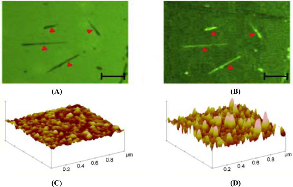 The immobilization of proteins onto ZnO nanorods can be effectively done by covalent attachment using either a single or a double cross-linker. For attachment via a single cross-linking layer [103], first the nanorods were immersed into a solution mixture containing ethanol with 3-(trimethoxysilyl)propyl aldehyde dissolved in water and acetic acid. The substrate containing the nanorods was treated with N2 gas three times at 120 °C. The antibody was activated using amine functional groups. Then the aldehyde layer present in the nanorods was made to react with the amine group-functionalized antibodies forming a very strong covalent attachment. The antibody attachment was analyzed by attaching FITC to the antibody and inspected using a fluorescence microscope. Figure 12(A,B) below show the microscopic image of nanowires with biotin and fluorescent microscopic image of nanowires with biotin, respectively. As an improvement to this method, Hunt et al. have done the covalent attachment of the antibodies using a double-linking layer [104]. Two samples containing the ZnO nanorods were treated with ethanol to clean the surface followed by addition of (3-glycidyloxy-propyl)trimethoxysilane (GPS) to one of the samples. The other sample was treated initially with (3-mercaptopropyl)trimethoxysilane (MTS) followed by treatment with N-γ-maleimidobutyryloxy-succinimide ester (GMBS) which is the second covalent linker. Finally, the antibodies were attached to both the samples which had a uniform distribution all over the surface. The activation of the layer using the cross linkers were confirmed by taking AFM images as shown in Figure 12(C,D). It is said that the fluorescence content on the GPS was comparatively less than the florescence present on the sample containing MTS, which proves that the antibody immobilization can be improved by using MTS rather than GPS.