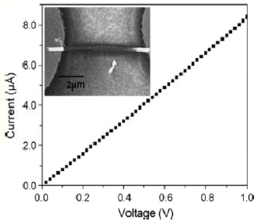 The dielectrophoresis method of aligning the nanowires was used at recent times since the alignment is easier and also because comparatively, a greater amount of nanowires can be aligned and tested at the same time. First, interdigitated electrodes were fabricated on a SiO2 wafer using a photolithography process with chromium and gold. The polymer nanowires were then dispensed all over the electrodes in a random fashion. The presence of nanowires was verified by measuring the I-V characteristics of the electrodes, so a potential was applied across the ends of the electrodes and the current was measured with the use of a potentiostat. Figure 4 clearly shows the amount of potential applied to the electrodes making the nanowires align with a small amount of current passing through them [44]. The nanowires present in a 2 μL diluted suspension were dispensed on 16 pairs of well aligned interdigitated electrodes [40]. A 1 V potential from peak to peak and 5 MHz frequency was applied to the electrodes allowing the nanowires to align along the corresponding electric charges of the material. This means that the nanowires are present in between the electrodes with their ends touching the electrodes [37].