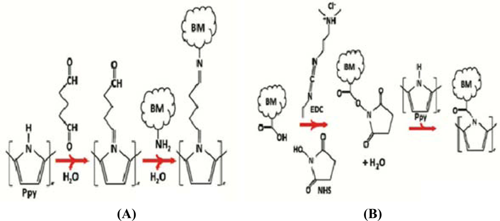 Polypyrrole, a conducting polymer which is more conductive, stable and biocompatible than other polymer materials is reviewed in this paper. In 1916, polymerization of the monomer was first done by a research group [27] who oxidized it into a fine black amorphous powder and named it “pyrrole black”. Later, these monomers were grown by controlling the thickness of the polymer film [28], which attracted a great deal of attention from many researchers in the biomedical applications field [29]. At present, nanosize polypyrrole is grown, which allows even a very low current to pass through, making the device even compatible with the human body. According to [30], electrochemically prepared pyrroles are more conductive and stable when compared to the chemically prepared ones.