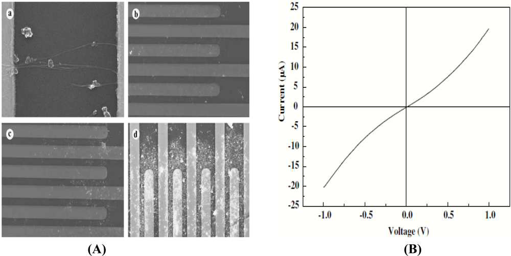 DC field-assisted alignment of the nanotubes has been reported [59] in which the nanotubes can be formed wherever needed. According to the report, they developed an electrode having finger-like structures using photolithography and a lift off process. The alignment was performed by suspending the freshly prepared CNTs on the top of the electrode and varying the voltage for different conditions. The authors modified the nanowire density by varying the amount of nanotubes being dispersed on the electrodes. This was done by varying the concentration of the solution containing the nanotubes. I-V characteristics were used for analyzing the amount of current passing through the electrodes, as shown in Figure 6(B).