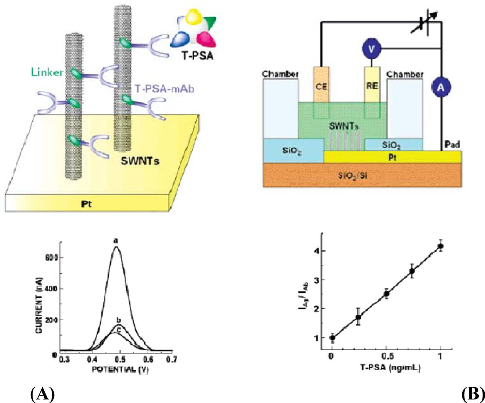 An electrochemical microelectrode containing platinum along with modified SWCNTs has been reported (Figure 8) [74] for label free detection of analytes. Electrochemical signals at various concentrations were recorded using differential pulse voltammograms. An increase in current was noticed due to the increase in concentration of the T-PSA. After many trials, it was confirmed that the addition of T-PSA onto the antibody-attached SWCNTs lead to the increase in the current. A slight defect occurred in the monolayer due to the compact packaging of the antibody on the SWCNT surface that could cause a very high electron transfer rate along the electrolyte and the CNT.
