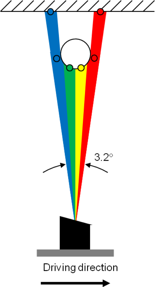 The Ibeo Lux scanner measures points from four different layers simultaneously and it has a theoretical scan rate of up to 38,000 points/second if only one return per laser pulse and per layer is assumed. The scanner is able to record up to three returns per laser pulse and per layer. This allows it to get hits from the ground or building walls even when covered by nearby trees or vegetation. Its distance measurement range is from 0.3 to 200 m (50 m for targets with 10% remission), its ranging accuracy is 10 cm, its angular resolution is 0.25°. The divergence of the laser beam is 0.8° horizontally and 0.08° vertically with respect to the scanner body in the current instrument configuration. This indicates that objects may appear extended in the horizontal direction. This elongation caused by the wide footprint of the laser scanner could be mitigated by applying some kind of thinning method to the data. However, as the elongation effect is moderate at short distances, it did not have a significant effect on the classification results. On the other hand, the wide laser beam also allows the laser scanner to cover the target area extensively and acquire points from thin targets as there are no gaps between the layers of the laser scanner. Figure 2 shows an indicative schematic of the measurement geometry.