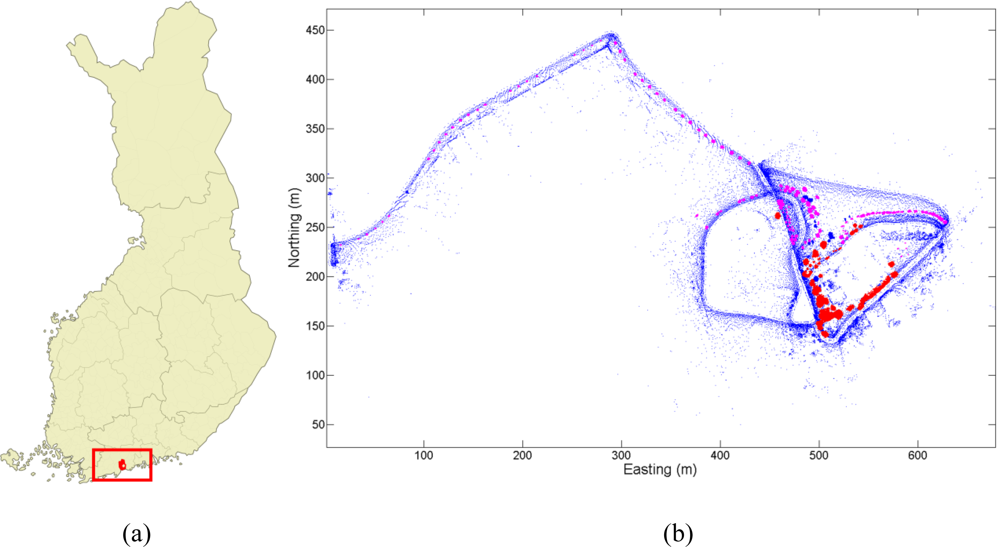 The integration of laser scanning data and spectral data was done by direct georeferencing based on the post-processed data of the inertial navigation system. The post-processing was done through Kalman filtering using Waypoint Inertial Explorer software and GPS base station data from Geotrim’s VRS network. Exact information about the accuracy of the data is not available as no control points were measured, but based on the error metrics (e.g., standard deviation and separation between forward and reverse solutions) it is assumed to be better than 10 cm. Additional information about the system and data processing can be found in Jaakkola et al. [1].