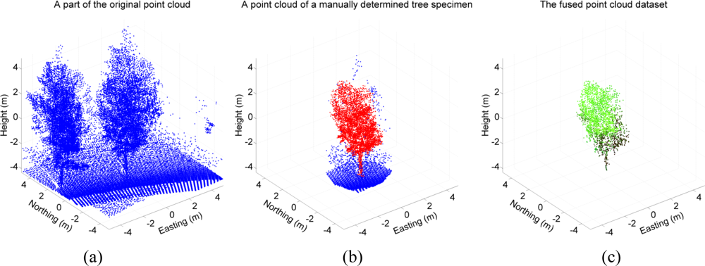The data fusion process was as follow: The IMU locations were first interpolated by using the time stamps of the laser points. Then, the point cloud data were transformed into the Sensei inertial frame coordinates. After the transformation, possible overlap between the spectrometer line images and the laser points was tested first in the Sensei’s driving direction (horizontal). Next, the overlap test was repeated in the vertical direction for the pixels of each spectrometer line found within a laser spot. The colour values of every pixel located in a single laser spot were normalized against the reference spectrum measured from the Spectralon™ reference plate. The colour values of hyperspectral pixels were averaged if more than one pixel was found within a single laser point. An example of a manual tree specimen determination is shown in Figure 4.