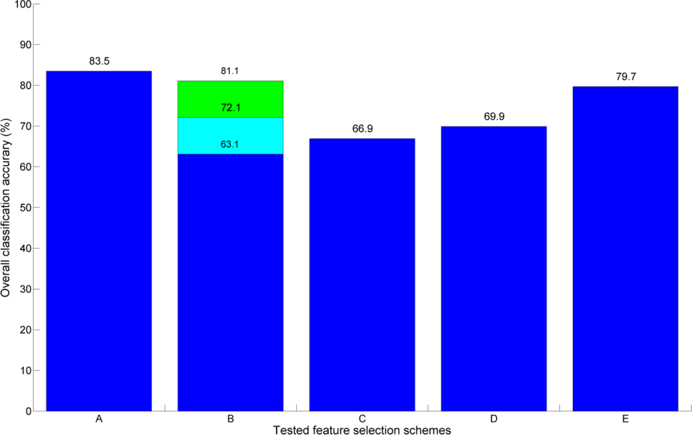 The classification results are presented in five parts: (i) The overall results of both single and paired LiDAR-derived features; (ii) The overall results of both single and paired hyperspectral features; (iii) The comparison of the results obtained from the LiDAR-derived and the hyperspectral features; (iv) The detailed classification results of combined feature quadruples consisting of two hyperspectral features at different wavelengths and of two LiDAR-derived features; (v) Different classification feature selection methods are compared in order to validate the presented results.