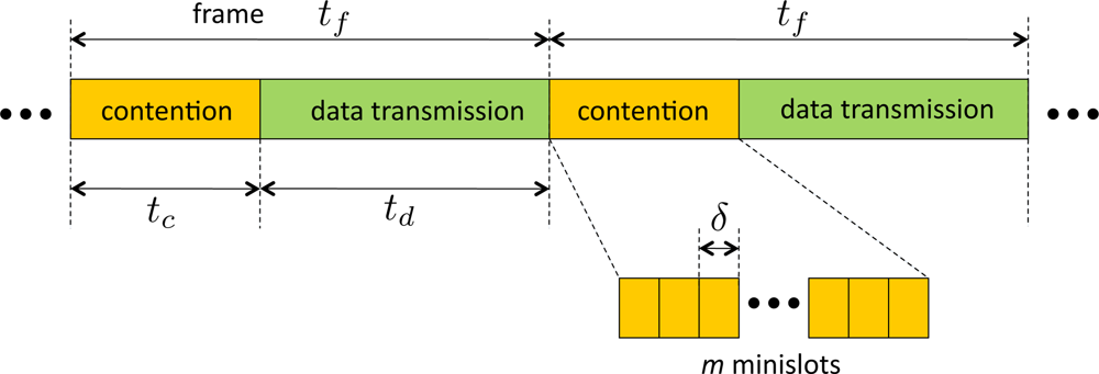 The nodes are allowed to begin transmission at only one of the minislots. If there is only one sensor that transmits the earliest in the contention phase, we say the sensor wins the frame. The winner of the frame will transmit during the frame. The transmission from the winning node is assumed to be detectable by the contending nodes. When the contending nodes senses the channel busy, they stop further attempts for contending and wait for the next frame in which they retry transmission. If more than one nodes attempt to transmit in the same minislot, a collision is declared. We assume that such collision can be sensed by contending nodes, i.e., both collision and successful transmissions are ‘channel busy’ events. When a collision occurs, all the contending nodes cease the attempts to transmit on the current frame, and resume contention on the next frame.