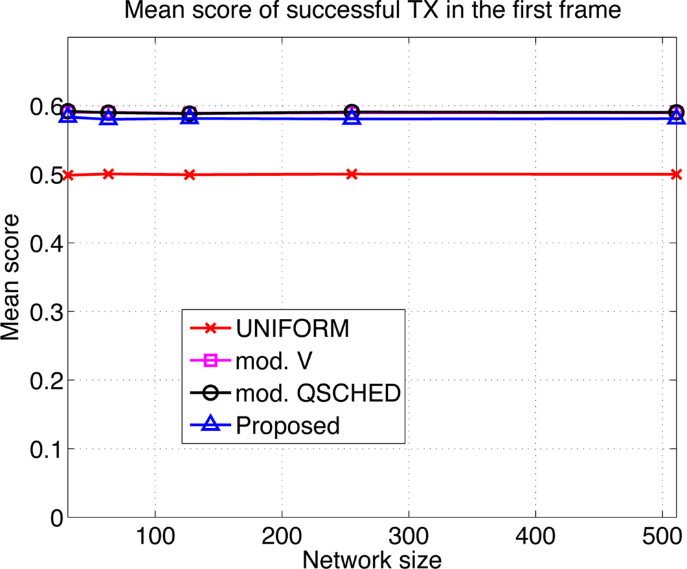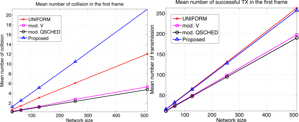 We compare the performances of different algorithms for channel access. Figure 9 shows the mean latency associated with the channel access schemes. The selective forwarding and overhearing are used with varying medium access schemes. ‘Mod. V’ (resp ‘Mod. Q-SCHED’) represents the modified policy V (resp. Q-SCHED algorithm). We observe that the proposed scheme incurs the lowest mean latency both for m = 10 and 30. Somewhat surprisingly, UNIFORM scheme performs better than modified policy V and Q-SCHED. The result can be explained as follows. Figure 10 shows the statistics on the number of collision and the amount of traffic generated at the first frame. The first frame is defined to be the frame at which the data gathering is initiated. Note the generated traffic is potentially the heaviest at the first frame. On the left of Figure 10 is the mean number of collisions in the first frame. We see that the number of collision of the proposed scheme is higher than UNIFORM scheme, while Q-SCHED and policy V have considerably lower number of collisions. However seemingly high number of collisions for the proposed scheme is in fact relatively small compared to the number of successful transmissions in the first frame which is shown on the right of Figure 10. We observe that the number of successful transmissions in the first frame for policy V and Q-SCHED are lower than the proposed and UNIFORM scheme. The reason is that, under policy V and Q-SCHED algorithm, there is nonzero probability that a node is ‘idle’, i.e., it does not participate in channel contention. While in the proposed and UNIFORM scheme, every node attempts transmission at every frame. This also accounts for the lower number of collisions for policy V and Q-SCHED algorithm. Figure 11 shows the mean score of the successful transmitted packet in the first frame. Since the scores of sensors in the first frame are n i.i.d. uniform RVs on [0,1] by definition, we see that the mean score for UNIFORM scheme is approximately 0.5. We see that the modified policy V and Q-SCHED has a mean score that is only slightly higher than the proposed scheme, which is possible however, by reducing the number of successful transmissions in the first frame. Figure 11 shows that the proposed scheme finds compromise on these aspects: it achieves higher mean score than UNIFORM scheme without excessively reducing the number of successful transmissions in the first frame. Although not shown here, we observed that the number of collisions subsides faster in subsequent frames for the proposed scheme, compared to other schemes. This is a synergistic effect with selective forwarding and overhearing, since successful transmissions of high-score data contribute to suppressing traffic and reducing contention by these techniques, which eventually leads to decreased latency.