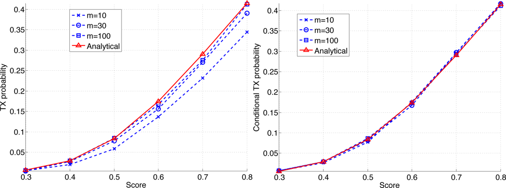 In this subsection we study the effect of a finite m on the analytical estimate Equation (3). We consider a set of nodes with n = 6 having scores (0.3,0.4,0.5,0.6,0.7,0.8). We assume every node interferes with every other node. The probability of winning a frame under the proposed medium access scheme is numerically computed. On the left of Figure 12 is a plot of the probability of winning a frame as a function of the score with varying m. For small m, there is a gap between the probability of winning and the analytical estimate. This is due to the fact that the analysis assumes m → ∞ and does not account for collisions. However the gap appears to be small for a substantially small value of m, e.g., m = 10, considering the relatively large number of contending users, i.e., n = 6. For larger value of m the estimate becomes fairly accurate.