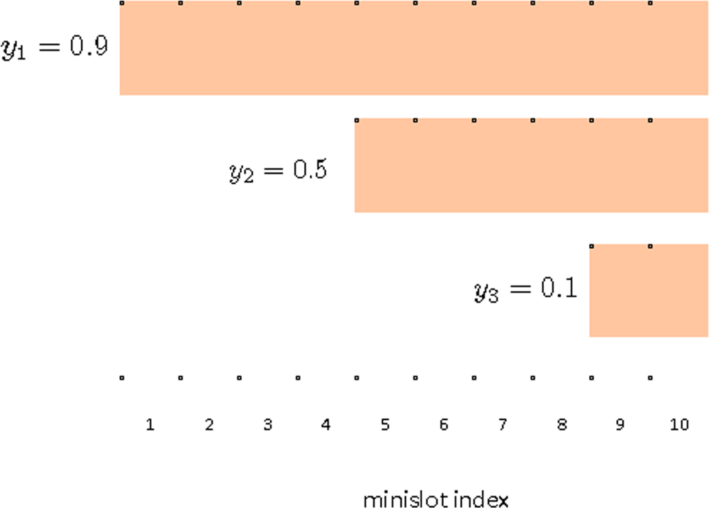 An example is illustrated in Figure 2 assuming m = 10, γ = 1, c = 0 and ß = 1. There are three contending sensors with ID 1, 2 and 3. The scores for the sensors are given by y1 = 0.9, y2 = 0.5 and y3 = 0.1. From Equation (2), ECW size for Sensor 1 is m, thus it fully utilizes the contention phase period. Sensor 2 has the score 0.5, thus from Equation (2), its ECW size is given by 6. Sensor 2 picks a minislot randomly from minislot index 5, 6, . . ., 10. Thus the probability of selecting a minislot within ECW is 1/6. Sensor 3 has a low score of y3 = 0.1, thus gets ECW size of 2. The purpose of the parameter ß is to set a lower bound on the size of ECW. Since ß ≥ 1, the lower bound on w is at least 1.