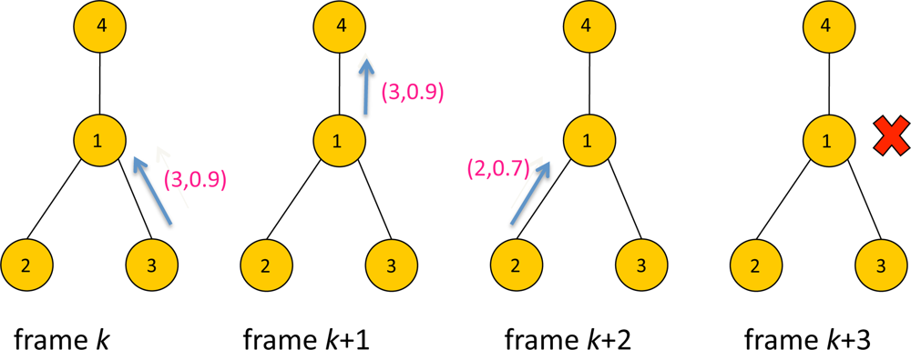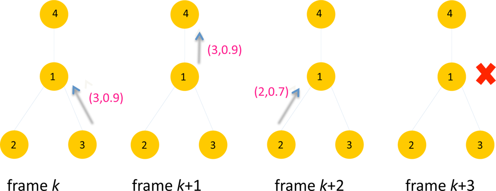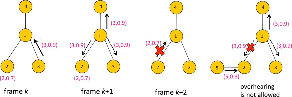 Figure 6 illustrates an example of overhearing. There are four sensors with ID 1,2,3 and 4. The packet contains data with a format (i, yi) where i is sensor ID and yi is the score. At frame k, Sensors 2 and 3 contended for transmission to Sensor 1, and Sensor 3 won frame k. Thus Sensor 3 transmitted the packet with data (3, 0.9) to Sensor 1, while Sensor 2 waits for the next frame. At frame k +1, Sensor 1 forwards the data (3, 0.9) to its parent, Sensor 4. Sensors 2 and 3 are assumed to be idle, i.e., neither transmitting or receiving at frame k + 1, which means they are eligible for overhearing the packet containing (3, 0.9) transmitted by Sensor 1. Having overheard data that is greater than the current data to transmit, Sensor 2 updates z2(k + 1) to 0.9. Since there is no need to forward (2,0.7) to Sensor 1, Sensor 2 remains idle at frame k + 2. Now suppose Sensor 2 had a child node. If Sensor 2 had been receiving data from its child sensor at frame k + 1, it would not have been able to overhear Sensor 1’s transmission, e.g., see the rightmost of Figure 6. In that case Sensor 2 might have transmitted at frame k + 2.