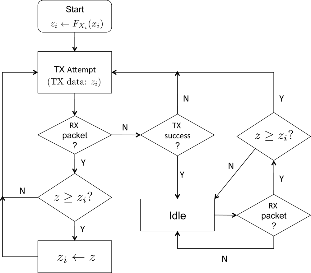 Let us denote the maximum among the scores which Node i has been successfully received for forwarding up to frame t ∈ ℤ+ by zi(t). We define zi(0) = FXi (xi). Suppose at frame s ∈ ℤ+, the node has received the data z requested for forwarding. In case where zi(t) > z, Node i will discard the data, and if zi(t) already has been transmitted, the sensor will go idle: otherwise the sensor will proceed to transmit zi(t). In case where zi(t) ≤ z, Node i updates zi(s) to z, and this data will be queued for transmission. A flowchart in Figure 4 illustrates the above procedure of selective forwarding. Note z in the flow chart denotes the received data (score). Also note that a sensor may receive data while attempting to transmit, and the procedure shown in Figure 4 captures such aspect combined with the selective forwarding.