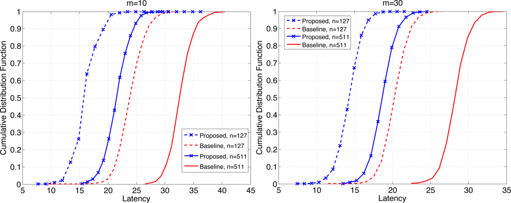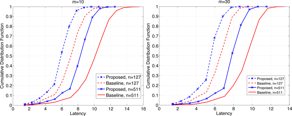 Figure 7 shows the CDF of the latency when b = 1 for n = 127 and 511, each for m = 10 (left) and 30 (right). We see that the proposed scheme clearly outperforms the baseline scheme. For example when the probability of retrieval of the maximum data is given by 0.8, the proposed scheme achieves the latency that is roughly 19%–20% (resp. 15%–17%) lower than the baseline scheme when m = 10 (resp. m = 30). The overall latency is reduced for larger m since the contention window has become wider. The relative performance of the proposed scheme is slightly better for smaller m, which suggests that as the level of contention become higher, the proposed scheme becomes more effective.