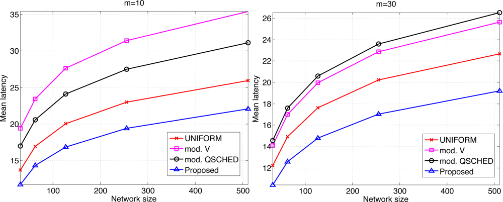 Figure 8 shows the CDF of the latency when b = 3 for n = 127 and 511, each for m = 10 (left) and 30 (right). The reduction in latency at the probability of retrieval of 0.8 is 32–33% (resp. 30–32%) when m = 10 (resp. m = 30). Clearly the gains have increased compared to the case where b = 1. With larger b the network undergoes higher level of contention and temporary congestion, thus the gain in latency reduction due to the proposed scheme increases under high load on the network. The mean latency has been compared in Table 1. The relative reduction in mean latency by the proposed scheme ranges 15.1–18.0% when b = 1, and 31.1–34.3% when b = 3.