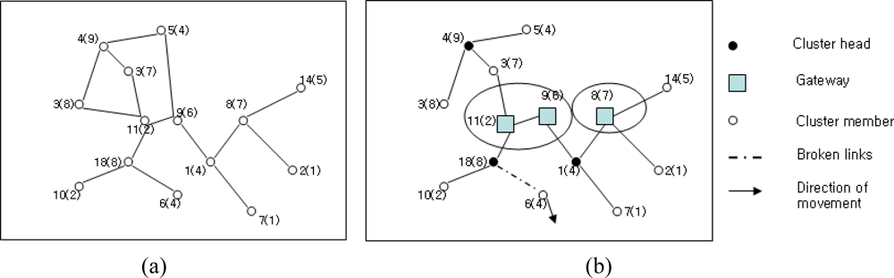 The small circle in the figure represents the nodes in WMASNs. The lines joining the circles denote connectivity among the nodes. Every node is identified with an ID number (i.e., 1–14) along with a number within parenthesis. The numbers in the parenthesis are the weights of the nodes. These weights are measured with respect to various node parameters and apply the selection of clusterheads. Every node in the flat structure shares equal responsibility to act as a router to route the packets to every other node. However, to achieve better routing efficiency, this structure requires an amount of message flooding. Occasionally, such message flooding has the merit of reducing overhead of the MAC layer. On the other hand, nodes in the hierarchical structure are assigned with different functionalities while acting as a clusterhead, gateway, or a cluster member as shown in Figure 1(b). The clusterhead in the hierarchical structure plays an important role in inter-cluster and intra-cluster communication. Thus, the clusterhead works as the local coordinator for its member nodes and manages the cluster members. A gateway node is a node that connects the bridge between the inter-cluster and intra-cluster communication. A gateway works as the common or distributed access point for two cluster heads. Both of the distributed gateways provide the path for inter-cluster communication. The ordinary nodes of the cluster are the immediate neighbors of the cluster heads. They have the capability of serving as either a head or a gateway whenever selected to do so.