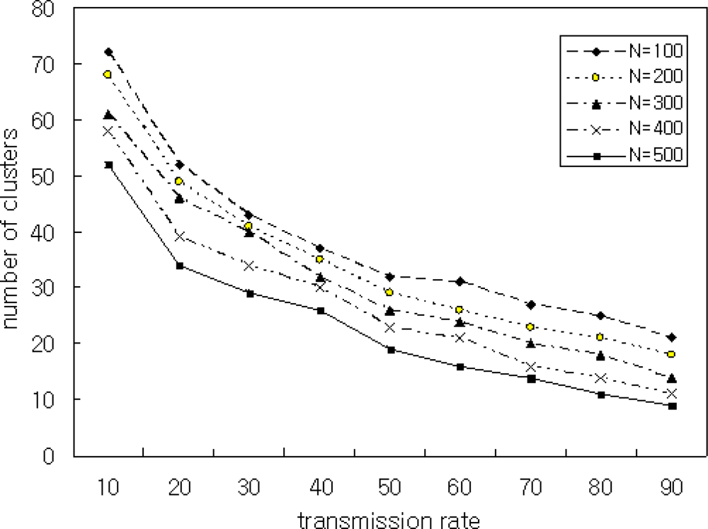 In Scenario 5, we simulated the number of clusters by varying transmission ranges. To achieve this, we varied the transmission range between 10 and 90, and we varied the number of nodes N by 100, 200, 300, 400, and 500. The simulation results are shown in Figures 10 and 11.