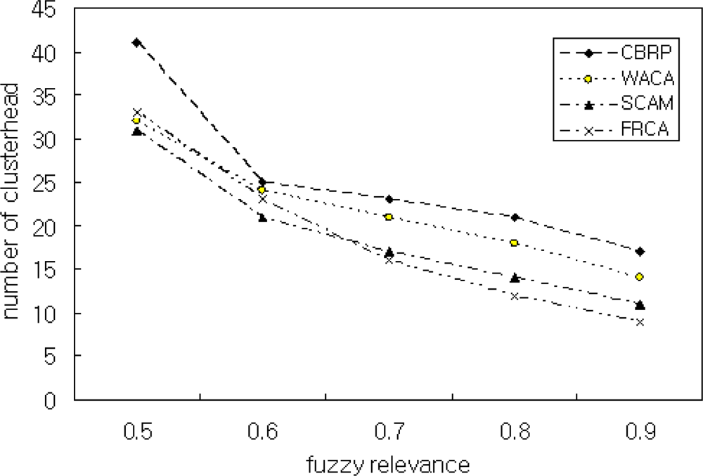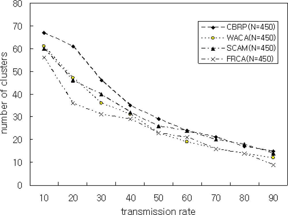 Figure 10 shows the average number of clusters is relatively high when the transmission range is small. On the other hand, when the transmission range increases, the number of clusters created decreases. A smaller backbone reduces the routing overhead. Therefore, the transmission power of a node in a heterogeneous environment depends on the quality of dominating nodes. Figure 11 shows the simulation result with the number of nodes N = 400 and μ = 0.9. The proposed FRCA creates fewer clusters compared with those of CBRP, WACA, and SCAM. This is because the proposed FRCA applies FRD(μ) and results in form fewer clusters. But if FRD(μ) decreases more and more, then the cluster number and size decrease in proportion to FRD(μ), which affects the performance. Therefore, FRD(μ) is important to select the cluster head. Thus, the proposed FRCA selects the cluster head stably by filtering out nodes with low signal intensity and low battery power using the proper FRD(μ).