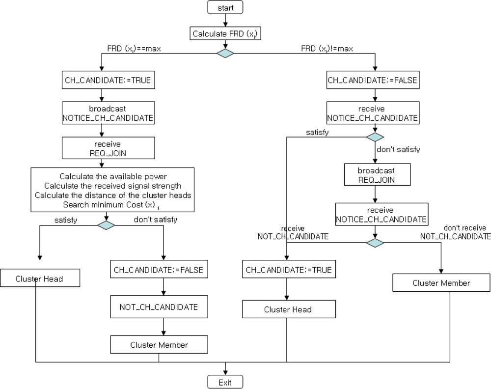 First, a node with more energy power and stronger signal has more probability to be the cluster head in a cluster. Thus, the node with the minimum cost becomes the cluter head candidate. Second, a non-cluster head node with higher energy power than those of neighbor nodes may become a cluster head candidate. The selected cluster head candidate has to notify its neighbor nodes of cluster head candidate selection (NOTICE_CH_CANDIDATE). Third, cluster members that are not the cluster head broadcast join request message (REQ_JOIN) to the nearest cluster head. If a node is not the cluster head candidate (NOT_CH_CANDIDATE), then the node forwards to neighbor nodes that the node is a cluster member. The whole process is shown in Figure 3, and the corresponding cluster head selection algorithm (Algorithm 1) is given as follows.