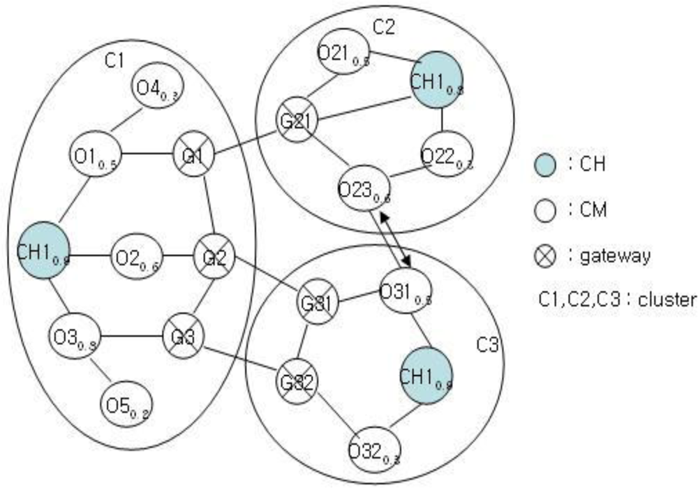 Figure 5 shows the cluster structure after the clustering of the structure in Figure 4. Each cluster of C1, C2, and C3 has a structure with a CH, gateway, and CM nodes. Clustering is performed for C2 and C3 to balance with C1. This clustering is very important in the proposed mechanism. The clustering of C1 and C2 or that of C1 and C3 results imbalance. After clustering, the clustering information is stored as shown in Tables 1 and 2 for achieving stable management and performance improvement of clusters.
