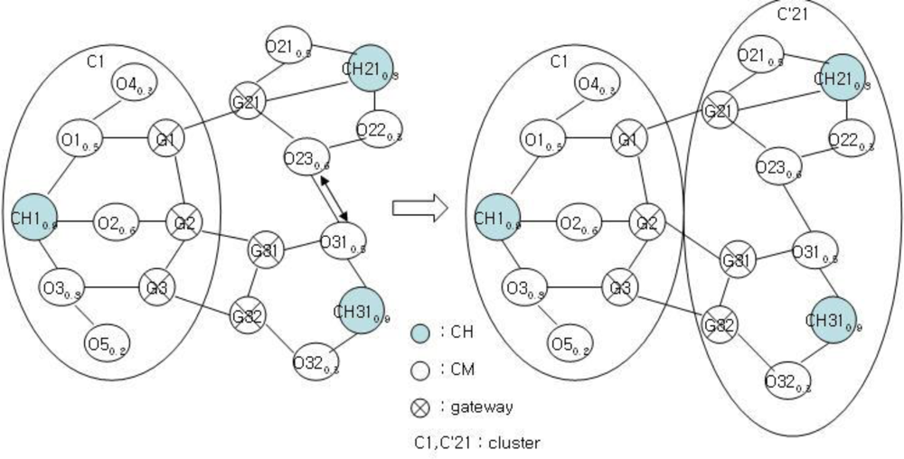 After clustering, the existing cluster structure of Figure 4 is modified as shown in Figure 5, and the CH is to be changed. As shown in Figure 5, the nodes CH31 and CH21 become the new CH and the CH candidate, respectively.