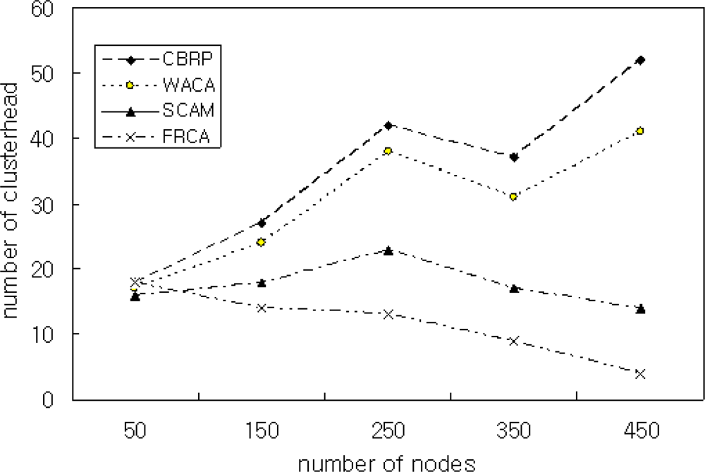 Figure 6 shows the simulation result for comparing CBRP, WACA, SCAM, and the proposed FRCA when the number of nodes is increased from 80 to 380. The simulation result shows that the proposed method has almost the same number of cluster heads as that of the other methods when the number of nodes is 80. As the number of nodes is increased, however, the proposed FRCA generates less cluster heads than the other methods. This means the proposed FRCA maintains the network performance efficiently by restricting the number of cluster heads.