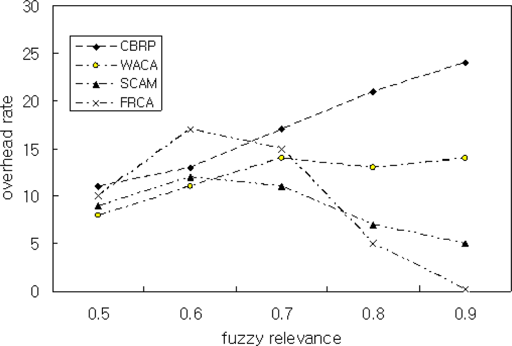Simulation Scenario 2: This scenario is to estimate the overhead according to fuzzy relevance degree μ. The simulation is performed for μ of 0.5, 0.6, 0.7, 0.8, and 0.9.