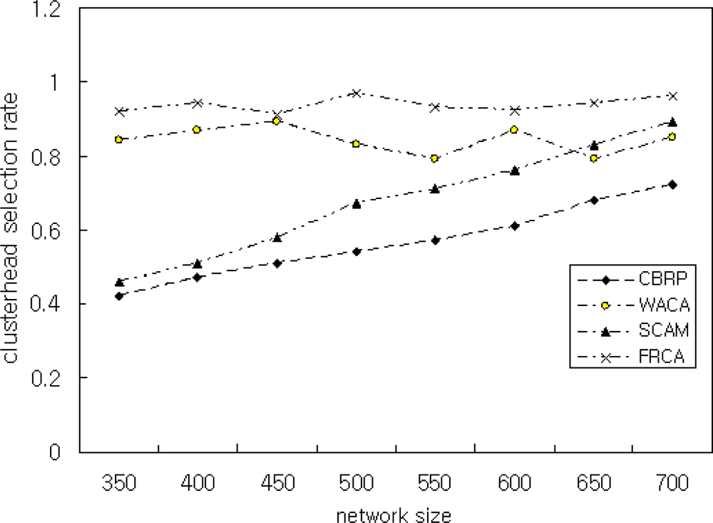 In Scenario 4, we showed the performance of the proposed FRCA by varying network sizes. To achieve this, we vary the network size by 350, 400, 450, 500, 550, 600, 650, and 700. The simulation result is shown in Figure 9. As shown in Figure 9, the proposed FRCA achieves better CHER than SCAM that is known for its good performance. Better CHER of the proposed FRCA is due to the classification of nodes as the CH node, CH candidate node, or CH member nodes. Thus, the performance of the proposed FRCA does not degrade with the increase of network size. CHER is influenced by nodes with μ < 0.8 that means low signal intensity and low battery power. Therefore, the simulation is performed with FRD μ ≥ 0.9.