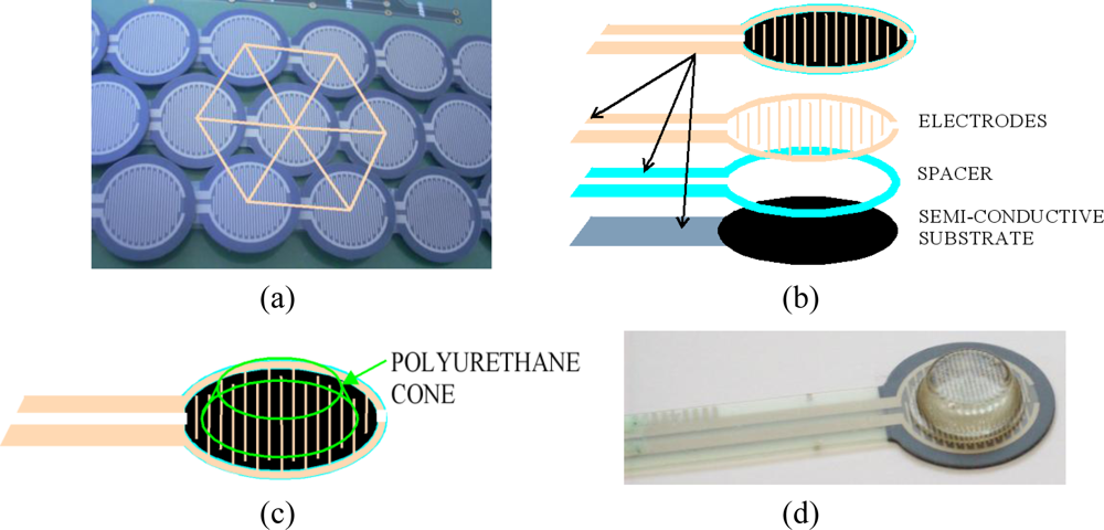 Tactile sensors are basically arrays of force sensors that enable a whole specific surface area to be monitored, instead of only discrete point pressure monitoring. They are demanded in applications where unstructured environments or uncertainty are present, such as minimally invasive surgery (MIS), robotics, rehabilitation, virtual reality, telepresence, or industrial automation []. Many different approaches have been proposed to manufacture these sensors, most of them are based on piezoresistive or capacitive principles, and a few are based on optical or piezoelectrical transduction []. Many of these sensors are made with silicon or polymers using microelectromechanical systems (MEMS) technologies. These technologies are not oriented to large area devices, so they are usually proposed for applications that demand high spatial resolution and good performance in terms of errors, such as MIS. However, large area devices can be made with skin patches, i.e., by connecting several arrays in more complex structures. For instance, a piezoresistive MEMS on polymer sensor that covers an area of 25 mm × 25 mm is presented in []. The scalability to larger sensors is limited by the wiring complexity and the authors proposed the addition of silicon based integrated circuits on the same substrate to achieve a modular and large area sensor. Another modular approach based on capacitive MEMS on polymer is examined in []. Other implementations build a sensor with MEMS on silicon and soldered in an array on a flexible PCB []. Nevertheless, those sensors that are not oriented to cover the fingertips but for example the forearms, do not require a high spatial resolution and are usually developed with other technologies.