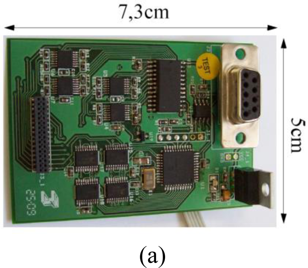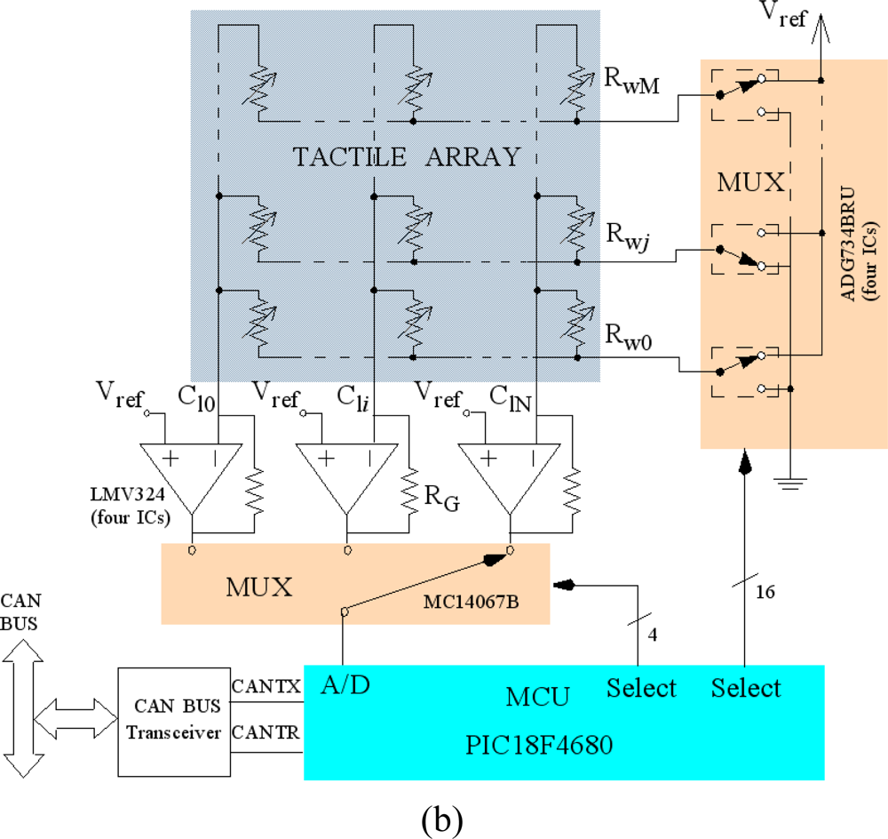 Figure 10(a) shows the local electronics of the smart tactile sensor. It is based on a microcontroller PIC18F4680 and is in charge of scanning the array, storing the data and sending it via CAN bus to a central processing unit. More capabilities can be added to the smart sensor by taking advantage of the microcontroller. Figure 10(b) shows a basic schematic of the main blocks in Figure 10(a) except the power supply module. The array is scanned and every tactel output is read.