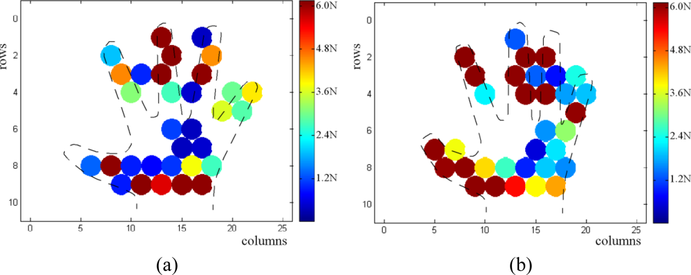 Figure 11 shows the readings of the smart tactile sensor when its surface is pressed with the hand. The shape of the hand is clearly noticeable and the information about the existence of contact as well as the force exerted is provided.