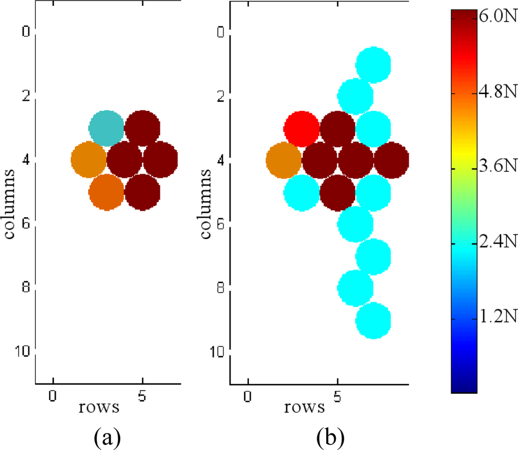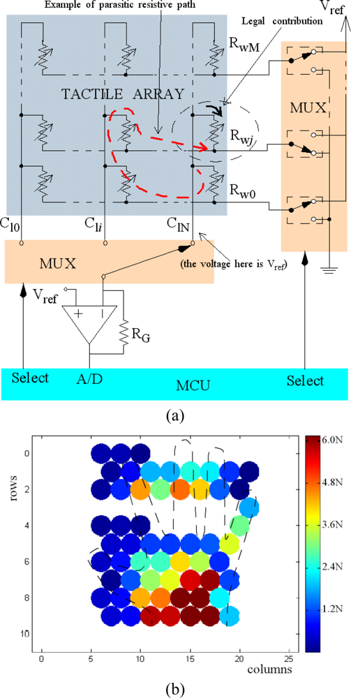 Note that one operational amplifier is required per column in Figure 10(b). Their purpose is to set the voltage Vref at the tracks of all columns. Since the voltage of all rows that do not contribute to the output is also set to Vref, any possible parasitic path is short circuited. This is a common grounding technique [] in sensors developed from a continuous film of conductive rubber or polymer because parasitic resistors are present between tactels. We think it is worth highlighting here that these electronics must be used even when we have a discrete array. This is true in our case, because we have an array of force sensors. Nevertheless, once they are arranged in rows and columns and connected by the corresponding addressing tracks, multiple parasitic paths appear. One of them is depicted in Figure 12(a), where a simpler electronics layout that does not cancel the interferences is shown. The left part of Figure 12 shows the readings provided by this electronics. Note that crosstalk makes the shape of the hand indistinguishable and it is not possible to determine the orientation and size of the object on the sensor. Similarly, the implementation in [] describes a technique where tactile sensors are formed by dispensing conductive polymer on copper electrodes. This is highlighted as a technique to reduce crosstalk, although grounding is also necessary.