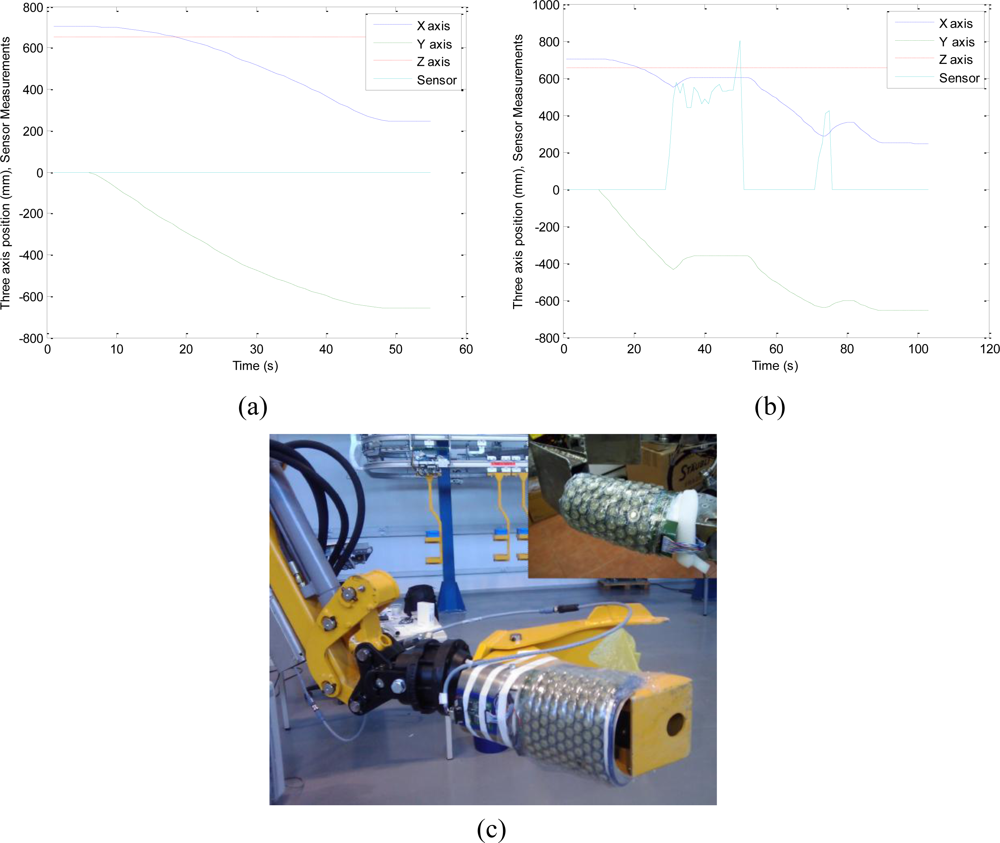 Figure 13 illustrates this behavior. It shows the Cartesian coordinates x, y, z, referred to the base reference system of the robot as well as the average force registered by the tactels whose readings are higher than a certain threshold. Figure 13(a) shows a circular trajectory followed by the manipulator when no contact is detected, while Figure 13(b) shows the described reactive behavior when the manipulator makes contact with an obstacle twice. The first time the contact remains even when the manipulator has moved back, and the second time the contact is undone before the manipulator completes the backward movement, therefore the robot resumes its task. This behavior would keep people safe as well as objects surrounding the rescue robot and the robot itself.