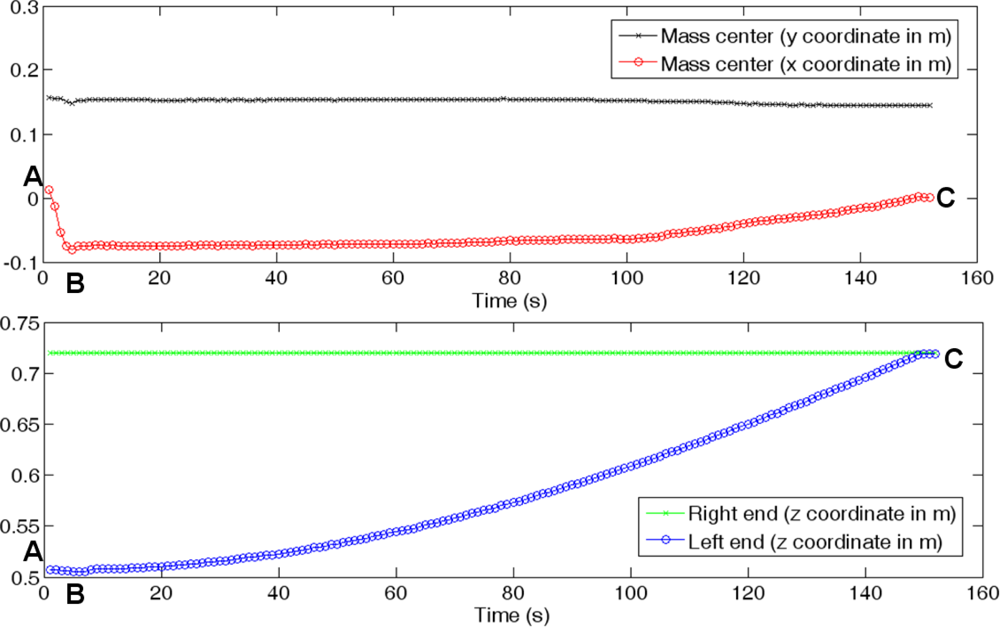 This can be seen in Figure 15, where the trajectories of the center of mass and the robot arm are depicted. Now the robot lifts its arm until the location of the center of mass goes back to the initial value in (A). At this point, the heights of both ends of the tube are similar again (C), as can be seen in Figures 14 and 15.