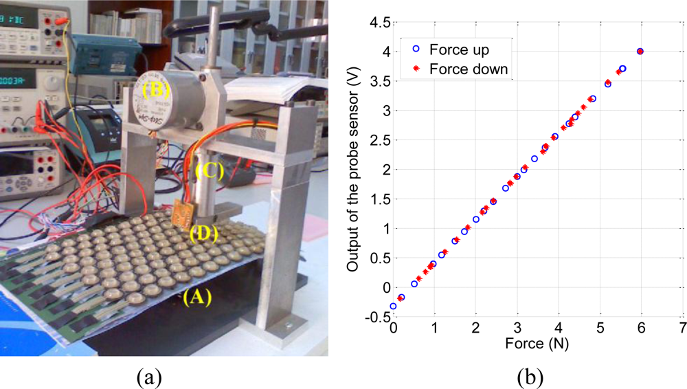 Finally, another test was carried out to obtain information about the mismatching of the sensors in the array, as in []. The output of 16 tactels was read with the set-up in Figure 2(a) and the results are shown in Table 2. The variations could be tolerated for practical purposes [], or some calibration procedure can be implemented that takes advantage of the microcontroller of the sensor.