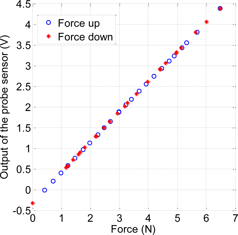 A first simple test to know the influence of the polyurethane cone was carried out. It consisted of repeating the calibration procedure but placing a cone between the probe and the balance. The curve obtained is shown in Figure 3. The larger the difference between this curve and the calibration curve in Figure 2(b), the larger the influence of the cone would be. Since this difference is negligible, we can conclude that the piece of polyurethane does not introduce a significant disturbance in terms of hysteresis or linearity.