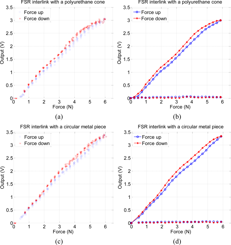 Another test was done with the cone atop of one sensing resistor, and both attached on a rigid and flat surface. The data registered by the set-up in Figure 2(a) is shown in Figure 4(a,b). On the left, the readings from ten cycles of increasing and decreasing force are shown while the figure on the right depicts the mean value and standard deviation obtained from this data. The same measurement was made but replacing the polyurethane cone with a circular piece of metal and a small piece of fabric at the interface with the sensor to achieve a uniform contact pressure. The results are in Figure 4(c,d), where the meaning of data is the same as in Figure 4(a,b). The curves are also very similar this time, with no significant differences in terms of errors. The gain is slightly larger in the case of the circular piece, but it is because its diameter is 11.5 mm while the diameter of the basis of the cone is 10.2 mm. The diameter of the active area of the sensing resistor is 12.7 mm, so a cone that fitted this area would perform better.