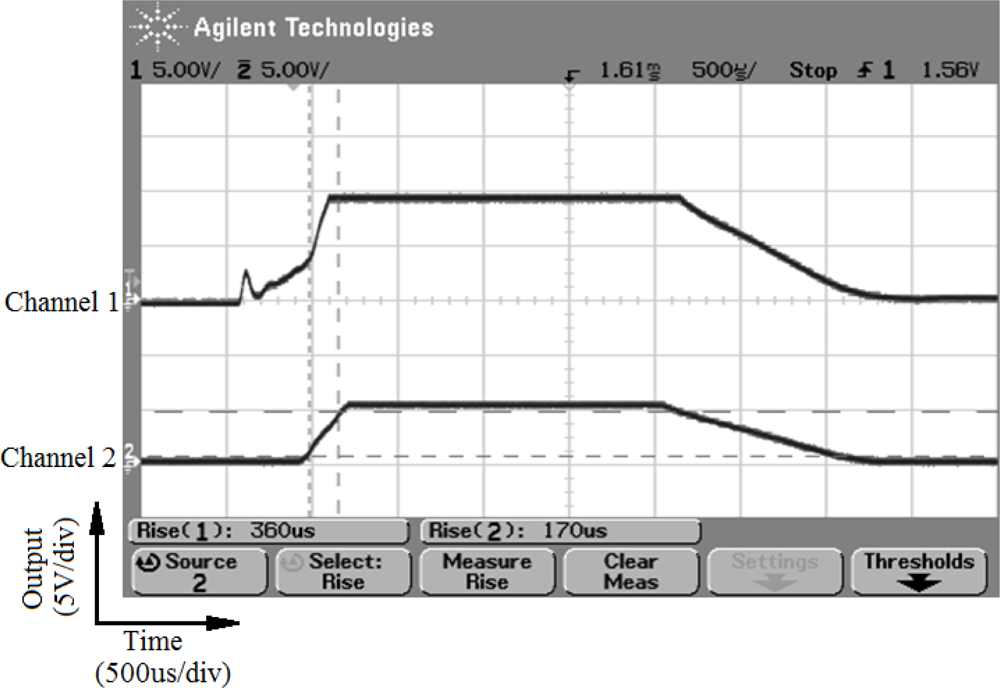 Two additional tests were made to establish the dynamic response of the modified sensor. FSRs have a rise time between 1–2 ms determined by their mechanical design. A simple test was made to assure the modification with the polyurethane cone did not change this dynamic response. Figure 5 shows the response to a force pulse measured by the silicon force sensor (top curve) and by the modified FSR (bottom curve). Responses are in the order of hundreds of microseconds, so they do not determine the limitation of the dynamic response of the sensor to meet a delay below 200 ms. This limitation will be given by the electronics discussed in the next section.