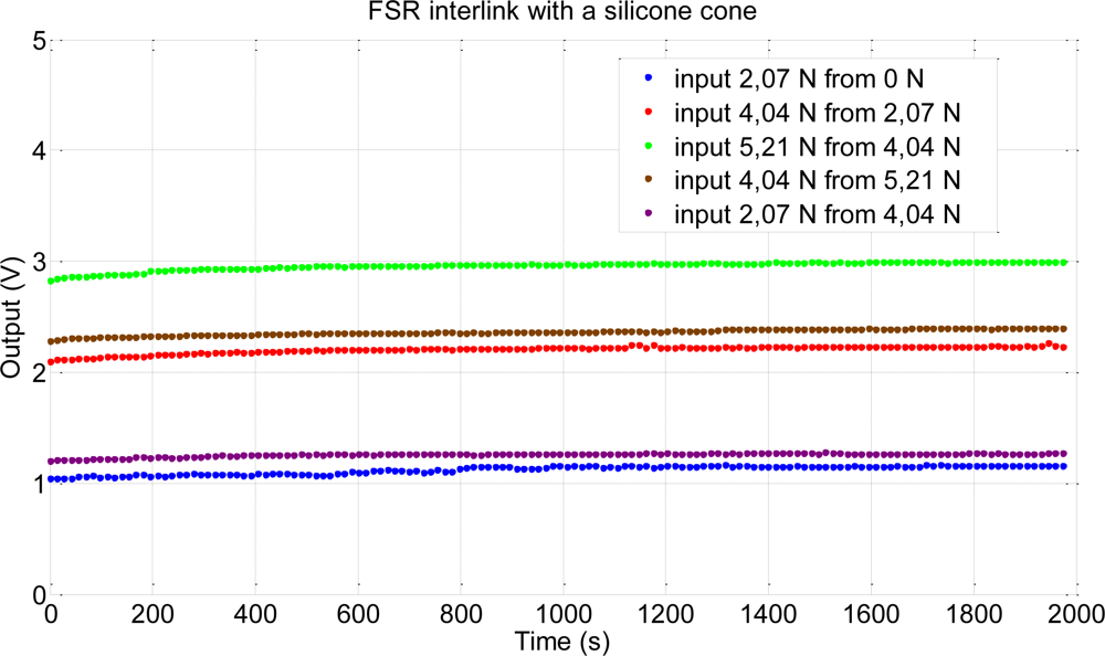 Regarding drift, we have followed a procedure similar to that reported in [] for a characterization of commercial force sensors based on similar principles. This procedure consists in measuring the drift not only when pressure is exerted on the sensor from a prior situation of no pressure on it, but also the result of a few increments from starting pressure different to zero. We also show results of positive as well as negative increments. Figure 6 shows the results of this experiment that was performed with the set-up in Figure 2(a). A drift of up to 10.7% of the full scale output in 1,974 s is observed in the worst case. The largest drift is observed when the starting pressure is zero. This effect could be reduced by applying a preload.