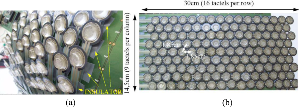 Regarding the sensor bandwidth, reading out the whole array takes 12.8 ms, so it is much lower than the 100–200 ms we had set as a maximum. Moreover, distance between centers of tactels is 1.85 cm (see Figure 7(b)), so it is also lower that 3.8 cm which we had set as a goal taking into account the static spatial resolution of the human skin in the forearm. Finally, Table 3 shows data from the proposed sensor and from other reported tactile sensor patches oriented to cover large areas.