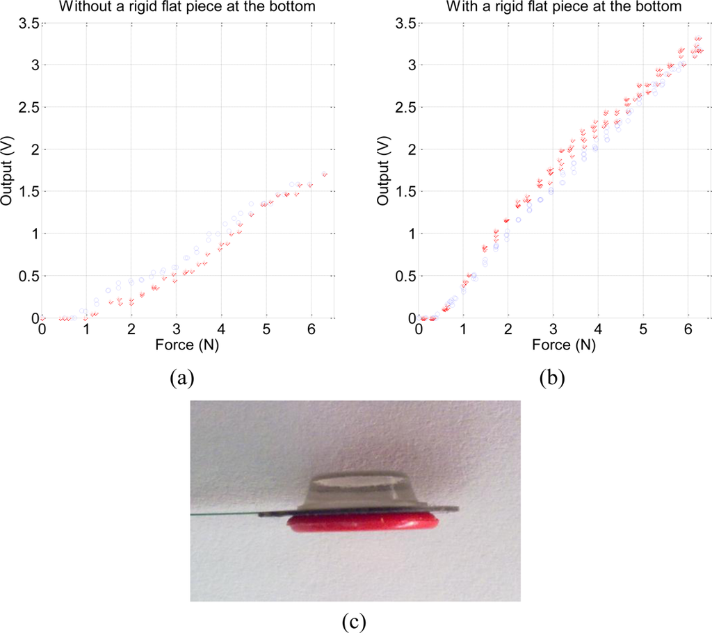 The other implementation issue refers to the convenience of having a flat and firm surface under the force sensing resistor. If the sensors are mounted as Figure 7 depicts and they rest on the tails of other sensors, a poor performance is observed. For instance, Figure 9(a) shows the output obtained with the characterization set-up of Figure 2(a) when the output from one of the mounted tactels is registered. A highly non-linear and distorted output is obtained. Another modification of the sensor is required to achieve an output similar to that reported by the manufacturer. It is done by attaching a circular rigid plastic piece at the bottom of the sensor, as Figure 9(c) shows. In this way the output from the sensor is quite linear, as Figure 9(b) shows.